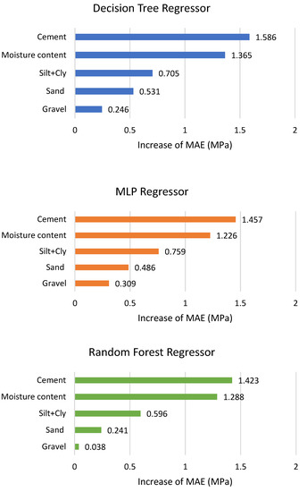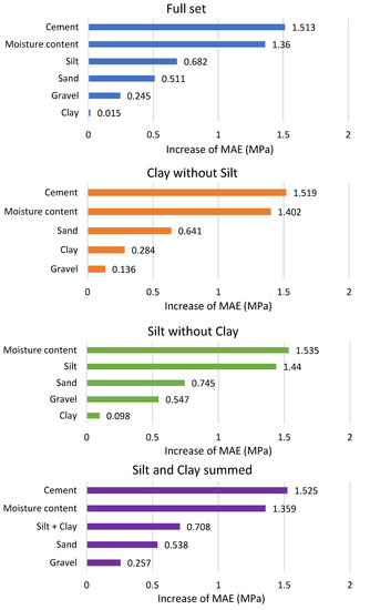 Once the decision about considering the joined impact of silt and clay on the compressive strength of CSRE is made, the cause of possible distortions of the result achieved is lowered. The calculations of drop-out loss could be made for all three models. Based on these calculations, feature importance plots are presented in Figure 6.