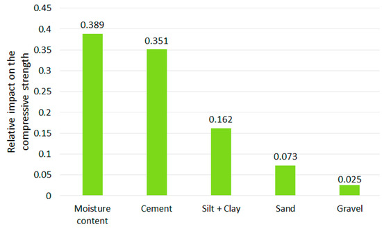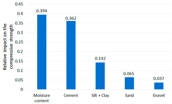 This study is focused on assessing the influence of each CSRE mixture component on the compressive strength. It is a crucial property of construction building material [12]. The CSRE mixture components considered in this research are the content of aggregates of different particle size distribution, cement addition, and water content. The particle size distribution is a property of soil that is also difficult to determine precisely in a construction setting. Many researchers have shown that CARE from soils that do not contain swelling minerals but have different grain sizes may have a big difference in compressive strength [12,19,23]. The soil-cement mixtures’ moisture content may change unexpectedly due to changes in atmospheric conditions prevailing at the construction site. Besides, it is difficult to accurately determine the moisture content of soil obtained from a construction site or to dry it to a constant mass.