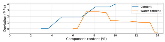 The more the cement content changes, the more the compressive strength of CSRE changes. This close to linear, steadily increasing dependency cannot be observed for water content. Lowering water content from 9.5% to 8.0% increases the output by approximately 1 MPa but lowering it more, down to 6.5% decreases the compressive strength by 1.5 MPa. This calculated phenomenon is confirmed by practical engineering [61,62,63]. It is due to the fact that a certain amount of cement requires an optimum amount of water, and the changes of the compressive strength observed on the plot (Figure 9) are also significant. The result from ALE can be transformed into ranking, based on the maximum range of the output changes (caused by changes of a component content). In the case of cement, the maximum change is 4 MPa. In the case of moisture content, close to 4 MPa, but less than the influence of cement content. So, applying the three explaining tools to the DTR model, the one-time (based on MSE reduction) moisture content is found as the most influential on the compressive strength, and two-times cement as the more important feature (based on drop-out loss and ALE). This kind of voting can be crucial for analyzing other phenomena. In the case of ranking of CSRE components, the results are consistent. The cement and moisture content should be matched during production process (to maximize the compressive strength).