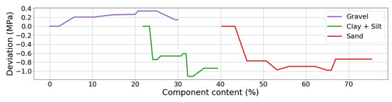 As previously mentioned, there is a strong, positive correlation between the content of silt and clay in CSRE samples. Feature importance calculated for all features (with the use of DTR model) has ranked the influence (on the compressive strength) of clay on the third place and the influence of gravel on the last place (the minimal influence). However, when the silt is removed from the database, clay becomes more influential (more than gravel). It can be observed in Figure 5 i.e., in feature importance plot. Considering that, and the strong, positive correlation between silt and clay, it was decided to analyze the summed content of silt and clay in CSRE mixture. Another important reason for making calculations for the summed content of silt and clay is that these two fractions of aggregates often appear jointly [19].