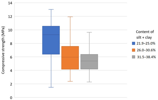 Figure 11 confirms the rule that the more silt and clay is in a CSRE mixture, then its compressive strength decreases. The presented box graphs are based on all 434 samples tested (with different all components of mixtures, as presented in Table 2). The quartiles of the compressive strength are presented for three ranges of clay and silt content (covering its full range in tested samples).