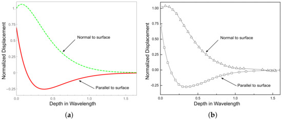 Next, the displacement amplitude distributions is given to investigate the differences between the propagating waves and the complex Rayleigh waves. Taking the expression as the conventional solution of the wave number, substituting the expression into Equation (12a–c), and then inserting the result into Equation (10a–c), the new form of displacement can be written as: