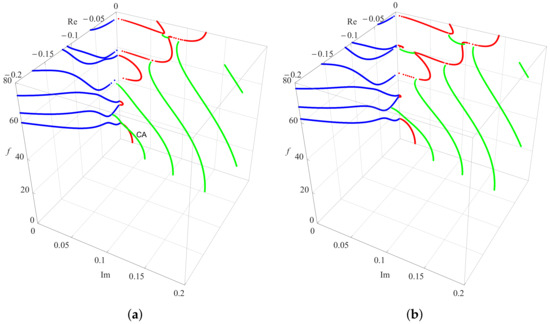 The first case is that the gradient coefficient n is in the gradient function, and the resulting three-dimensional frequency spectra is illustrated in Figure 3. The graphic shows that the pure real (blue dotted curves in Figure 3), imaginary (red dotted curves in Figure 3), and complex roots (green dotted curves in Figure 3) always appear in pairs and are symmetrical about the coordinate plane. This indicates that, if a or is a solution, then or is also a solution, and all complex solutions are evenly distributed in the four quadrants above in the form of conjugates and opposite signs.
