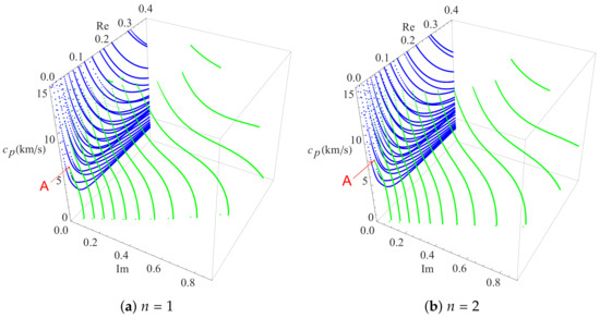 To investigate the influence of the heterogeneous character of the FGPM on the dispersion curves, the gradient coefficient n is chosen to be 1 and 2 in the present numerical analysis, and a dispersion comparison with n is is presented. As mentioned above, all these curves are symmetrical about the coordinate plane, thus only the dispersion curves in of one quadrant are given. Figure 4, with the same color scheme as in Figure 3, illustrates two three-dimensional dispersion curves for Rayleigh waves in FGPM half-space with different gradient coefficients. The results in Figure 3 and Figure 4 show that the frequency of the same order propagating mode increases as the gradient coefficient n increases for a specified wavenumber. This means that the speed of Rayleigh wave propagation becomes faster as the gradient coefficient n increases because the propagation speed of any point on the blue real branches is proportional to the ratio of . For pure imaginary modes, the high order branches tend to become more independent of each other as the gradient coefficient n increases, and wave mode conversions happen between them and complex waves. However, the most interesting thing happens with complex waves. Except for those local short complex modes appearing between high order pure imagine modes, the endpoints of complex modes fall on the pure real branches and move forward the f-axis gradually as the gradient coefficient n increases. As a result, this kind endpoints is reduced by one when n is 2, but the other falls on the pure imaginary branch, as illustrated in the Figure 4.