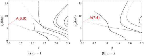 To find the exact points where the complex wave modes are near purely real propagating wave modes, the loss ratio is given. Here, denote the ratio , and set it to the abscissa. Then, set the phase velocity to ordinate, so that the coordinate system is established about loss ratio and phase velocity, as illustrated in Figure 7. As can be seen, the phase velocity of the first conversion point is 6.6 km when the gradient coefficient . However, the velocity increases to 7.4 km when the gradient coefficient . Thus, it can be concluded that the changes of the gradient coefficients have a great effect on the first point where the imaginary parts of the complex wave modes approach zero, and where the phase velocities of complex waves travel much more quickly than the propagating surface waves. The calculated velocity of propagating surface wave in PZT-4 is 2.2 km [36] and the measured value is 2.12 km [37].