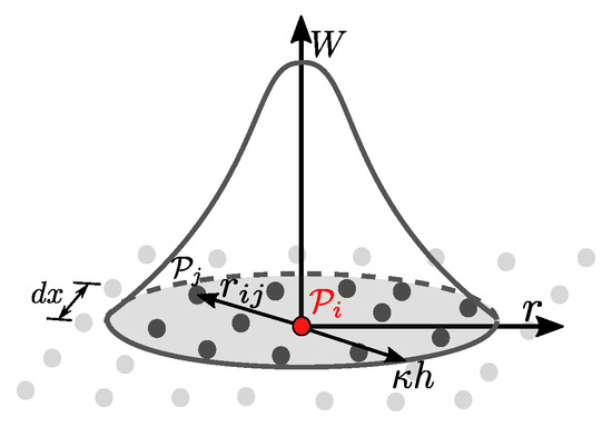 Since SPH is a particle method, the kernel representation is converted into a spatial discretization and therefore every field function transforms into a particle property . At point the property is computed by summation over function values of all neighboring particles with particle volume