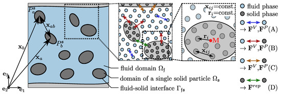 When considering solid particles immersed in the fluid phase, underlying conservation equations (Equations (2) and (3)) are also valid for the fluid–solid interaction. Since we consider a surface-coupled approach, no mass exchange between bulk phases at solid–fluid interfaces exist (Figure 2). However, solid–solid interactions, i.e., contact forces between two solid particles are described by a repulsive force approach [32]