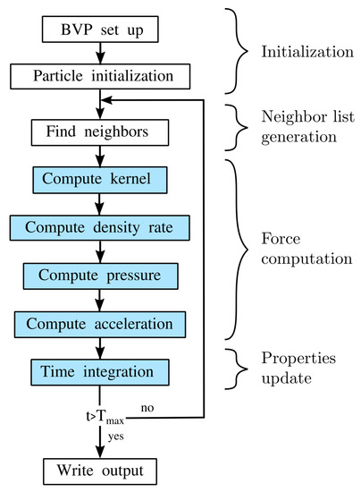 As already mentioned, the presented SPH approach is implemented using the HOOMD-blue [21,22] library where packages like particle initiation and neighbor search algorithms were efficiently implemented.