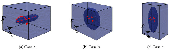 Details of the simulation input as the aspect ratio, initial orientation (, ) and Reynolds number (Re) are listed in Table 1. The three investigated cases (also shown in Figure 6) present both, oblate () and prolate () spheroids with initial states of the a-axis in -direction ( = 0) and -direction ( = ). Simulations are performed with an initial shear rate of due to motion of upper and lower wall particles with a constant velocity . We choose a discretization of 50 fluid SPH particles over the height . This leads to a discretization between 10 and 15 particles over the a-axis of the spheroid and approximately 190,000 SPH particles. Initial density was chosen to and initial viscosity is computed as a function of the Reynolds number by .