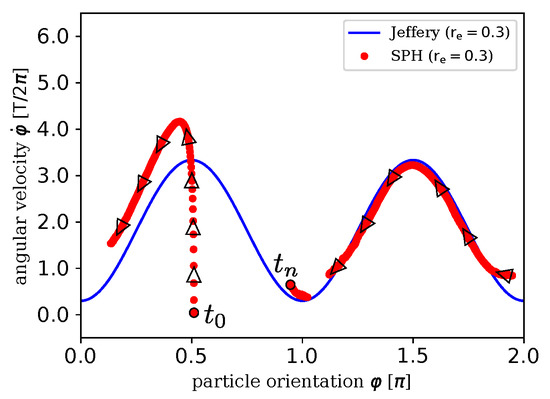 Aim of this section was to show first numerical results which are comparable to low-Reynolds number solutions validating the proposed numerical model. Due to the finite size of the computational domain, the chosen finite Reynolds number and the restricted computational time, we could not expect to get limit values of Jeffery. Nevertheless, we show a good agreement with Jeffery’s solution for the simulation with the lowest Reynolds number (Re = 1, case c). A detailed investigation of the Reynolds number-dependent motion of particles would be computationally challenging for Re < 1 regarding to the explicit nature of the presented SPH code.