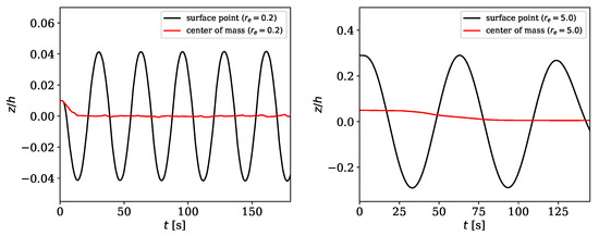 For cases a and b we observe a rotational motion as well (see Figure 8). Since Jeffery’s approach does not map particle rotation, when the rotation axis of the object is perpendicular to the shear direction (), a different representation of the rotation was used. Thus, the evolution of the coordinate in -direction (z) of a surface point normalized by the channel height h was plotted over the time t. As solid particles were not placed right in the center of the channel, the particles move translatoric as well. Figure 8 shows not only the (harmonic) motion of the material point at the surface of the particle, but also the (subtracted) translatoric motion of the center of mass. It could be clearly observed, that there is a stable periodic motion for spheroids with different aspect ratios where the initial state sets the a-axis parallel to the -axis (). In addition to (stationary) Jeffery orbits, the numerical simulations predict also transient effects if moderate Reynolds number have been chosen and the reference configuration of the center of mass of the immersed particle is not in the vertical symmetry plane.