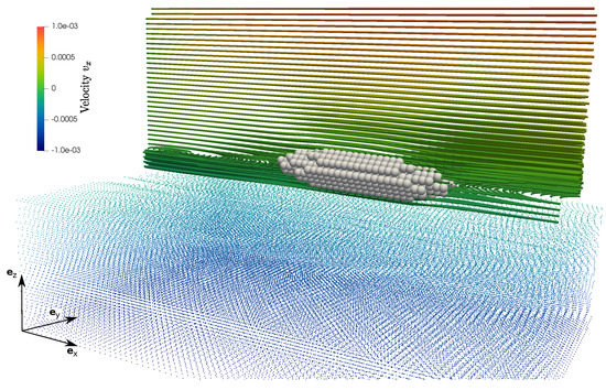 While simulating solid particles immersed in a fluid, also solid bodies and will interact with each other. To regard this, an additional term was included into the momentum balance Equation (9). The repulsive force is discretized as presented in Equation (8) taking into account . Based on that, the discrete balance of momentum (Equation (13)) is updated to