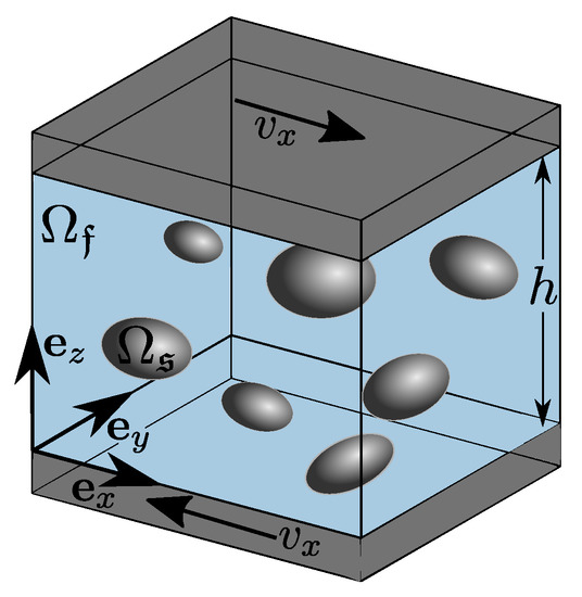 Considering solid particle motion in a fluid, suspensions are one possible application. In this case, the Péclet number which represents the ratio of mechanical to Brownian forces characterizes non-colloidal suspensions [26,27]. Simulating only large Péclet numbers, we assume that hydromechanical forces dominate the flow process and Brownian forces, and further colloidal phenomena, can be neglected. Moreover, the non-colloidal character can be defined by larger particle diameters () and a low aspect ratio between particle volume and particle surface. Therefore, we focus on diameters larger than and aspect ratios between 0.5 and 0.95.