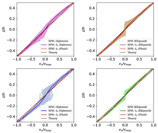 Resulting profile of velocity in -direction over coordinate for spherical solids (left) and ellipsoidal solids (right). While the black line represents the analytical solution for simple shear flow of a Newtonian fluid, the red line represents the mean velocity of a simulation of shear flow without solid aggregates (only fluid). Colored markers and and the same colored line represent SPH particle velocities and mean particle velocity, respectively. Investigated cases are shear flow with two spherical (pink, top left), two ellipsoidal (brown, top right), four spherical (blue, bottom left) and four ellipsoidal (green, bottom right) solid bodies.