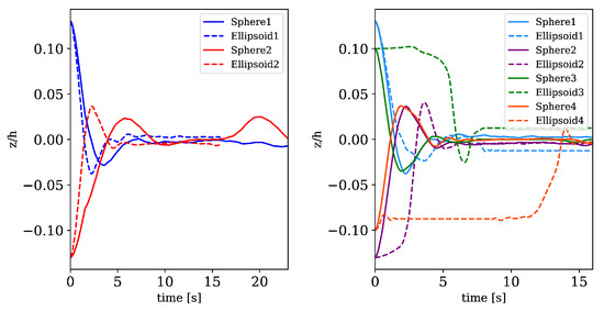 Motion of the center of masses over time for simulations containing two and four solid particles. Solid and dashed lines represent spherical particles and non-spherical particles, respectively.