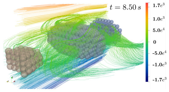 Figure 13 and Figure 14 show streamlines of the velocity in -direction () in the --plane and, for a better visualization, as a perspective view, respectively. Induced by surface coupled hydromechanical forces, fluid motion causes motion and rotation of solid particles until they are aligned in the centerline region and their main (largest) axis is aligned to the -axis. Using moderate Reynolds numbers (Re = 100), also chaotic motion including vortex formation takes place. In this example, no direct contact between solid aggregates occur. However, motion of the non-spherical particles influence the fluid flow as well, since they stay in the center with zero velocity and therefore slow down fluid flow different to flow without or with spherical bodies (compare as well Figure 11).