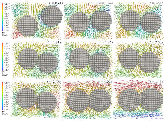 Velocity trajectories of for the evolution of contact between two solid particles over time (top left to bottom right). Contact occurs at and again at . Due to hydromechanical and hydrodynamical forces, particles stay close to each other even after contact.