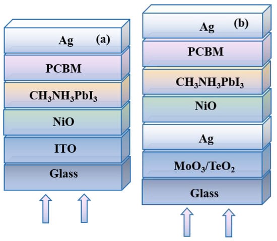 The calculated optical absorption ratio at different wavelengths of the perovskite active layer in the conventional structure and the optical microcavity structure is shown in Figure 5. All the devices have the same thickness of the perovskite active layer (320 nm). However, they show different light absorption ability. For the conventional device with the ITO electrode, the absorption ratio is good in the wavelength of 380 to 620 nm. Beyond 620 nm, there is a decline for the light absorption, which may be induced by the low light trap ability of ITO for the long wavelength. For the bare Ag incident electrode, the absorption ratio is the lowest, and the absorption mainly concentrates in the range of 400–600 nm, which is due to the low light transmittance of the Ag film. For the MoO3/Ag (35 nm/8 nm) incident electrode and the TeO2/Ag (35 nm/8 nm) incident electrode, the absorption is high in the wavelength range of 400–750 nm, which is slightly higher than the ITO electrode. This confirms the validity of the optical microcavity structure to improve the effective absorption ability of PSCs.