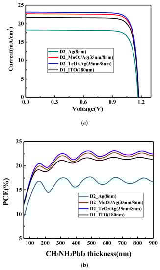 Using the method described in our previous publications [35,36,37,38] and also stated in the supplemental information, we first calculate the current–voltage (I–V) characteristics of PSCs based on the conventional ITO electrode to verify the validity of our calculation method in this work. As shown in Figure 3a, the device with the structure of glass/ITO (180 nm)/NiO (30 nm)/CH3NH3PbI3 (320 nm)/PCBM (45 nm)/Ag (100 nm) shows a PCE of 21.1% with short circuit current density (JSC) of 21.7 mA/cm2, open circuit voltage (VOC) of 1.17 V and fill fact (FF) of 83.2%. Many reports [1,2,5,6,7] has shown that the JSC can get the value between 20 and 24 mA/cm2, VOC can reach a value larger than 1.1 V, FF can obtain a value between 80% and 84% and PCE could be higher than 20% (the reported highest PCE is around 25%) in the experiments. Our calculated values fall in this range and the obtained parameters are reasonable. This confirms that the method to calculate the device characteristics is effective and feasible, which will be used in the following discussion.