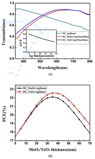 (a) Optical transmittance for Ag (8 nm), MoO3 (35 nm)/Ag (8 nm) and TeO2 (35 nm)/Ag (8 nm) with various light wavelength. Inset: the average transmittance for different Ag thicknesses; (b) variation of the calculated PCE with the different thicknesses of MoO3 and TeO2.