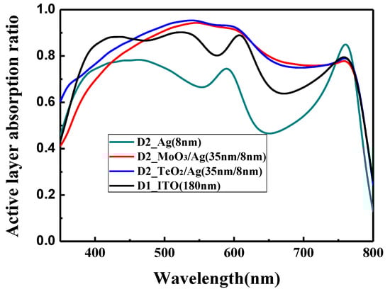 Active layer absorption ratio for device D1 and device D2 with various wavelengths.