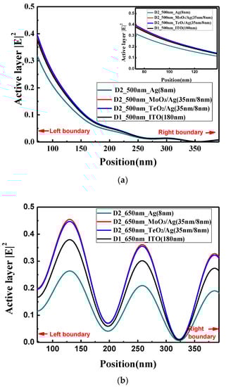 The optical electric field distributions in the perovskite active layer at wavelength of 500 and 650 nm are shown in Figure 6a,b, respectively. When the light wavelength is 500 nm, there is no obvious interference peaks in the active layer. The optical electric field of the device with the bare Ag electrode is the lowest, and the optical electric field of TeO2/Ag, MoO3/Ag and ITO decrease in sequence, which is consistent with the absorption rate in the active layer. However, the absorption difference among the devices with TeO2/Ag, MoO3/Ag and ITO electrodes is very small. When the light wavelength is 650 nm, the obvious interference peaks are observed. The optical electric field for the device with the bare Ag electrode is also the lowest. Compared with the conventional device with the ITO electrode, the optical electric field in the microcavity structure with the TeO2/Ag, MoO3/Ag electrode is obviously larger, which shows the advantages of the optical microcavity structure, which partially verifies that the careful design of the optical microcavity could improve the performance of PSCs.