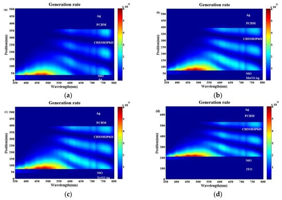Exciton generation profiles for optical microcavity perovskite solar cells (PSCs) with (a) bare Ag (8 nm) electrode, (b) MoO3/Ag (35 nm/8 nm) electrode exciton generation rate, (c) TeO2/Ag (35 nm/8 nm) electrode and (d) conventional PSC.