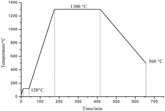 Each component was weighed according to the formula weight design in Table 1 and mixed in an agate mortar, and samples were then heat treated under air atmosphere and sintered in a muffle furnace (Shanghai YongWei Furnace Industry Co. LTD, Shanghai, China), according to the temperature control curve of the heat treatment shown in Figure 1.