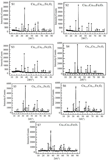 solid solution was selected for the study as it has a typical spinel structure, and Cu enables the formation of a mixed spinel structure during sintering [45]. The were prepared by a sintering process. Analytical grade Co2O3 (99.99%), CuO (99.99%) and Fe2O3 (99.99%) powders were purchased from Shanghai Aladdin Bio-Chem Technology Co., LTD (Shanghai, China)) and used as raw materials to prepare . The varying formulas of were designed according to different Cu doped ratios (mol%), and the molar content of CuO was regarded as being theoretically proportional to the content of the solid solution [22]. The formula design is shown in Table 1.