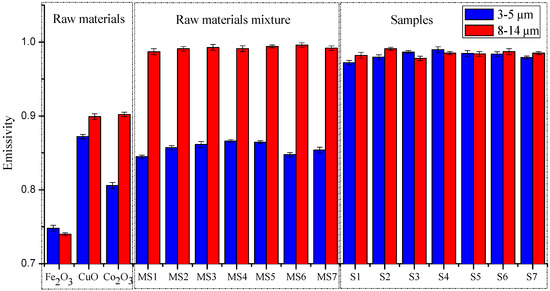 The emissivities of CuO, Co2O3 and Fe2O3 were measured, and the average values of emissivity were found to be 0.87, 0.81 and 0.75, respectively, in the 3–5 μm waveband at a temperature of 773 K. In the 8–14 μm waveband, the average values of emissivity were 0.90, 0.90 and 0.74 respectively. In Figure 4, the error bar of all the samples is under ±0.004 which means the accuracy of measured emissivity is believable. Furthermore, the mixing of the three oxides was found to make no contribution to the increase of emissivity in the 3–5 μm waveband, and there was no decrease in the emissivity of samples after sintering in the 8–14 μm waveband. However, samples S1–S7, which were sintered to be the solid solution, were found to remarkably increase emissivity, particularly in the waveband of 3–5 μm. It was therefore clarified that the strengthening effect of the ferrite spinel solid solution was effective.