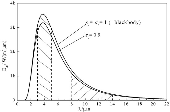 According to Planck’s law, the curve, Eλ-λ, of a graybody’s surface with an emissivity of 0.9 can be obtained at 773 K, as shown in Figure 5. The area below the curve is divided into five parts and indicates the emissive power in the 1–22 μm waveband. The proportion of each part can be obtained using integral computing, and the result is shown in Table 3.