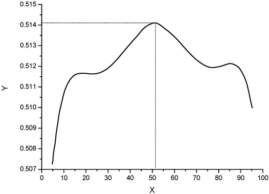 Using the Matlab software, extreme computing with the objective function based on Equation (5) to obtain the effectual extreme point (the curve seen in Figure 6) delivered the mole fraction of Cu as 51.41%, and the corresponding optimal formula of spinal materials was calculated as shown in Table 4.