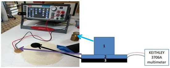 The existing procedures used [27,28] to measure in-plane the electrical resistance of materials could not be applicable in the case of a 30 mm diameter samples made of 3D printed conducting polymer 3D printed only onto one side of the textile material. Therefore, the in-plane measurement of the electrical resistance of the 3D-PPOT samples before and after was carried-out using an in-house customized system, with an acceptable reliability, presented in Figure 2. The three centimeters diameter electrode was applied on non-abraded and abraded 3D-PPOT materials under a weight of 300 grams and connected to a Keithley 3706A digital multimeter to visualize the current–voltage characteristic for a voltage value from −0.5 Volts (V) to 3 V and a step of 0.5 V, as shown in Figure 3. The electrical conductivity is obtained by determining first the slope of the linear fitting of the curve (Figure 3) and then by using the Equations (2) and (3). Five replicates for each sample were necessary in order to guarantee an acceptable standard deviation below 10%. Three samples were used in this experiment.