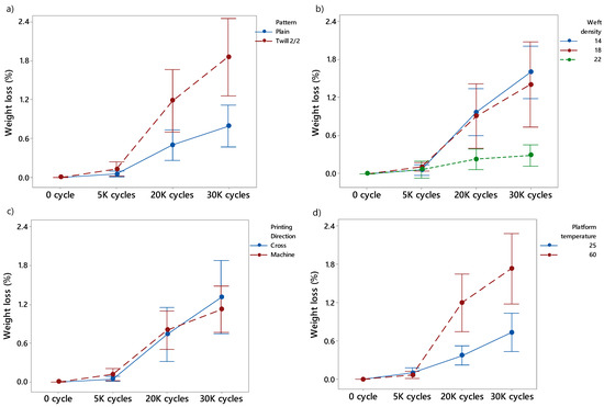 A visualization of the 3D-PPOT samples with different pattern and weft densities can be observed in Figure A1 (Appendix B). Visually, it is very difficult to evaluate the differences between the fabrics used, that is why the weight loss value was preferred to quantitatively analyze the influence of the FDM process. The mean values of weight loss percentage of the different samples for rubbing cycles of 5000, 20,000 and 30,000 and the ones of their end points are given in Table A2 (Appendix A). According to the weight loss percentage results of abrasion test, presented in Figure 6, the weave type or pattern (p-value < 0.01 above 20,000 cycles), the platform temperature (p-value = 0.000 above 20,000 cycles) and the weft density (p-value < 0.05 above 30,000 cycles) were factors which impacted the weight loss of the 3D-PPOT materials the most. In addition, the printing direction did not influence the weight loss at all. The lowest weight loss (in percentage) was obtained when using plain fabric as substrate, the lowest platform temperature (25 °C) and highest weft density (22 picks/inch). Due to its structure, plain fabric is more compact than twill 2/2 and that enhances the cohesion between the yarns and the fibers after FDM process. Thus, the 3D-PPOT materials using plain fabric as substrate is much harder to abrade and fracture compared to another one which presents floats such as twill 2/2. Similar trend can be noticed with the plain and twill 2/2 fabrics prior to 3D printing (Figure 4). In addition, in another study [1], it was previously shown that the adhesion force between the conductive PLA printed track was much higher using twill 2/2 substrate compared to plain one. It means that during FDM process, the PLA polymer may have penetrated more the twill 2/2 structure due to its higher porosity and roughness. This seemed to have a negative effect on its abrasion resistance. Similar explanation can be used to understand the better abrasion property of the 3D-PPOT materials when using denser fabric (22 picks/inch). Higher weft density demonstrated lower adhesion property while it reduced the weight loss after abrasion test due to a reduced accessibility to the whole structure of the textiles through the thickness.