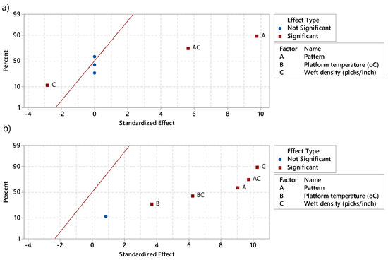 Effect of (A) pattern, (B) platform temperature in °C, and (C) weft density in picks/inch on (a) pore size of the fabric prior to 3D printing process and (b) 3D-PPOT materials after 3D printing process, obtained through pareto analysis of Minitab 17. AC and BC represent the interaction between the factors A and C and, B and C, respectively.