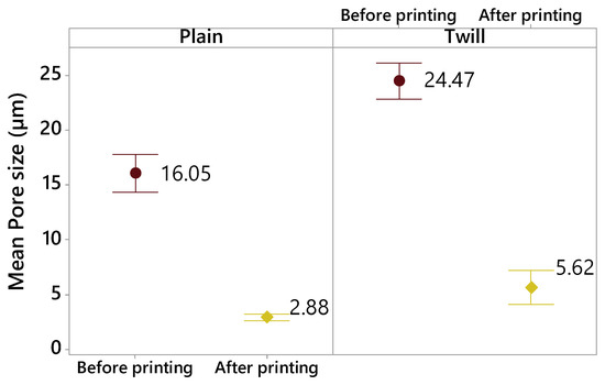 Prior to 3D printing process (Figure 9a), the pattern and the weft density of PET fabrics revealed to significantly impact its average pore size. This finding was already proven in the past by researchers [1]. It can be easily understood that the pattern as well as the weft density define the arrangement of the fibers in the structure. Indeed, fabrics which have a twill pattern are more open compared to those with plain ones. Furthermore, the higher the weft density, the more porous the textile structure and surface will be [1].