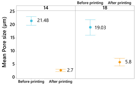 Mean pore size (µm) of the pores localized at the surface of the textile fabrics before 3D printing (in blue) and the 3D-PPOT materials after 3D printing (in orange) depending on the weft density of the fabric (14 and 18 pick/inch).