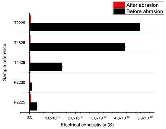 Electrical conductivity (S) before and after abrasion (20 K cycles) for the 3D-PPOT materials samples P2260, P2225, T1425, T1825 and T2225. P2260, P2225, T1425, T1825 and T2225. P2260 is designed as the following: plainof 22 picks/inch weft density and printed at a platform temperature of 60 °C.