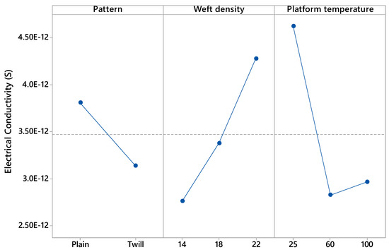 In addition, the effect of the pattern, weft density and platform temperature on the electrical conductivity after 20,000 rubbing cycles was presented in Figure 15. Plain fabrics have better electrical conductivities than twill ones after abrasion. The weft density of the fabric and platform temperature presented a significant effect. The higher the weft density, the higher the electrical conductivity and the platform temperature impact quadratically the electrical conductivity after abrasion.