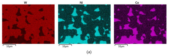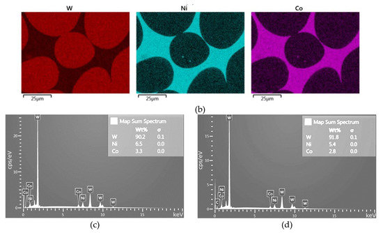 Figure 2d, the sintering temperature of 1525 °C results in the formation of the microstructure consisting of tungsten agglomerates and the NiCo matrix. Finally,