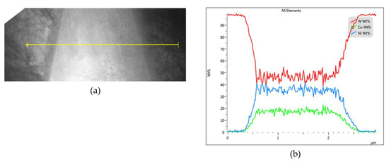 Figure 5b then shows the chemical composition (in wt. %) along a line scan measured across the mentioned interface. As can be seen, the content of tungsten increased to about 50 wt. % in the inter-agglomerate region by the effect of increased sintering time (negligible tungsten content within the NiCo matrix was observed for the sample sintered at 1500 °C for 60 min (not shown here)).