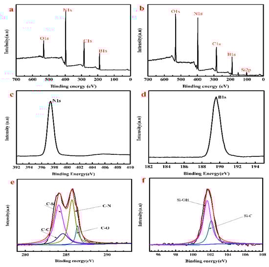 XPS results of BNNS and 560/BNNS are shown in Figure 6. All the spectra were calibrated with respect to the C 1s binding energy at 284.7 eV as a reference. The XPS survey of BNNS and 560/BNNS is shown in Figure 6a,b. The presence of Si is due to the addition of KH-560. It can be seen from Figure 6c,d that the binding energies of N1s and B1s are 397.9 eV and 190.5eV, respectively. The high-resolution C 1s and Si 2p spectra of modified BNNSs are shown in Figure 6e,f. The presence of C, O, B, N, and Si elements in the 560/BNNSs are evident. Figure 6e shows the presence of C–Si (284.6 eV), C–C (284. 8 eV), C–N (285.5 eV), and C–O (286.5 eV). Furthermore, the peaks at 101.6 eV and 102.4 eV in the Si 2p region correspond to the Si–OH and hydrochloride of KH-560, respectively. These results suggest that boron nitride was modified by dopamine hydrochloride and KH-560 [,].