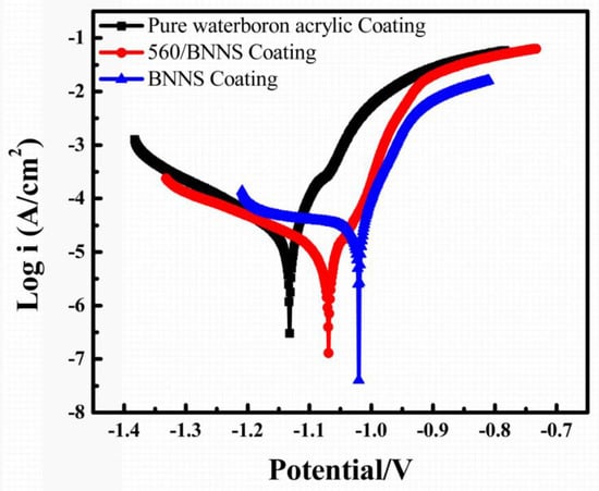 Potentiodynamic polarization curves of pure waterboron acrylic coating, BNNS coating and 560/BNNS coating.