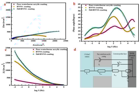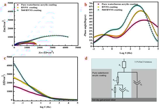 The EIS results of pure waterborne acrylic coating, BNNS coating and 560/BNNS coating. (a) is the Nyquist plot, (b,c) are the Bode plots, (d) is the equivalent electric circuit.