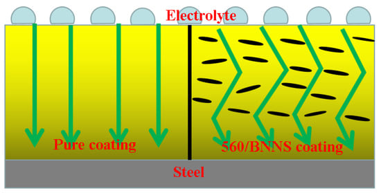 The addition of 560/BNNS can improve the corrosion resistance of waterborne acrylic coatings because the nanosheets are uniformly distributed in the waterborne acrylic coating and promote mutual crosslinking of organic molecules. In addition, due to the impermeability of 560/BNNSs, the coating is evenly and smoothly. Crosslinking through silane membranes can effectively control the propagation of cracks. These results show that the cracks in the organic coatings decreased considerably during drying. Due to these effects, a relatively complete and dense coating can be obtained, which enhanced its barrier performance. This can be observed by the morphology of BNNS/waterborne acrylic and 560/BNNS/waterborne acrylic coatings. Another reason for the improved corrosion protection is shown in Figure 12. By adding BNNS and 560/BNNS to the waterborne acrylic solution, the ion exchange between the solution and the metal substrate can be effectively suppressed, and the diffusion path of the ions is lengthened. This leads to a reduction in the corrosion rate and an increase in the corrosion resistance of the composite coating.