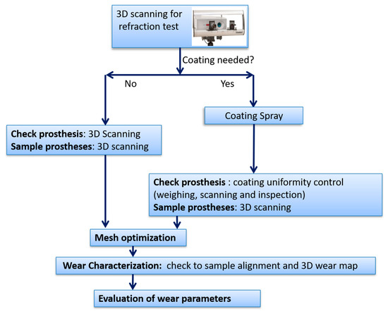 The wear characterization of biomedical components is important, because it allows one to quantify the performance and durability of such medical devices. The gold standard for in vitro wear assessments is the gravimetric method [1]. This method, widely discussed in other works [5,6], is used to measure the amount of the mass loss and does not give other information such as surface deviations. However, the geometrical characterization of worn bearing surfaces remains necessary for understanding the wear mechanisms [7,8,9]. Recently, volumetric methods, such as coordinate measuring machine (CMM) and micro-computed tomography (micro-CT) techniques have been used as alternatives to overcome the limitations of the gravimetric method [7,10,11,12]. To quantify complex geometries such as the menisci of a total knee prosthesis (TKP), the authors proposed a validated wear assessment method and procedure involving the use of advanced 3D optical scanning techniques [13,14,15,16,17]. As widely discussed in these works, wear can be assessed, considering both the volumetric wear rates and the 3D wear distributions over the specimen’s surface. In particular, wear distribution and deformations depend on the load configuration and on the positioning adopted during the wear process. With the 3D optical scanning techniques, both the volume wear rates, and the 3D wear geometrical parameters can be measured over the entire studied surface, even if the measured object has a complex shape [14,15]. Furthermore, no contact probes are needed to perform the measurement, as it happens by using coordinate measuring machines (CMMs) [18,19], assuring faster reconstructions and examinations of the entire specimen [11]. With respect to the weighing method, the assessment of the amount of the worn volume can be correlated with the weight loss only when the exact density of the material is known and when the material is supposed to be homogenous. Otherwise, the comparison can be done on the basis of the volume and weight wear rates, which give a correct insight into the phenomenon. Micro-CT provides 3D reconstructions based on the slicing of the sample and this technique can be more useful to analyze the internal parts of the specimens, surface finish, variation of thickness and local defects [6,7,12,20].