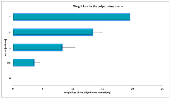 The test duration was set at 2 million cycles under a frequency of 1.0 ± 0.1 Hz. Gravimetric wear of the tibial specimens was assessed every 0.5 million cycles (Mc). At each stop for weight measurement, the cups were cleaned in an ultrasonic bath following a consolidated protocol and the ISO 14243 [21,22,23,24,25]. In particular, the mass loss was measured using a semi-microbalance (Sartorius Cubis MSE 225 S-000-DU, Goettingën, Germany), with an uncertainty of 0.01 mg and an accuracy of 0.01 mg. Each weight measurement was repeated three times and the average weight was used for calculations.