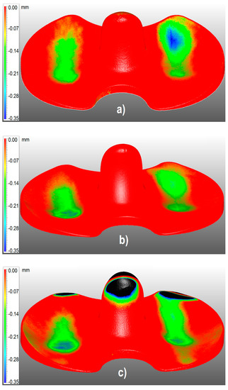 To the authors’ knowledge, few works can be found about the use of a digital procedure in different matters to evaluate 3D wear distribution [13,14,15,16]. The advantage of the wear assessment method based on optical 3D scanning is mainly the possibility of studying the wear phenomenon collecting many geometrical data, to evaluate most of the wear parameters and contact areas in a simple and fast way. In fact, several parameters can be evaluated, as the distribution of volumetric losses over the contact surface, the wear depths and the worn areas. Those parameters are very important in the wear characterization of prostheses, since they give a lot of information about how to modify or enhance the prostheses designs, to improve their wear resistance.
