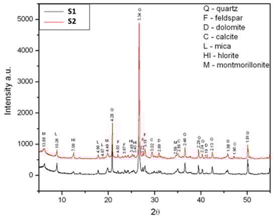 The results of the mineralogical analysis shown in Figure 1 point to the presence of the following minerals: quartz (Q), feldspar (F), dolomite (D), calcite (C), mica (L), chlorite (Cl) and montmorillonite (M) in the case of both raw materials. The results of the chemical and mineralogical analysis show that both raw materials have a very similar composition, with a small difference in the amount of CaO: 1.56 mass% in the raw material S1 and 3.24 mass% in the raw material S2). Clays with the CaO content under 6 mass% [32] are considered to be low-carbonate materials. Therefore, both raw materials can be characterized as low-carbonate—with a slight difference in the amount of the CaO content. The granulometric curves for both raw materials (Figure 2) are very similar, with a slight difference in the number of small particles, i.e., clay. The test results of the mineralogical structure of the raw materials, together with their granulometric compositions, show that the raw materials are sandy raw materials, with the presence of a small quantity of carbonates, rich in clay minerals.