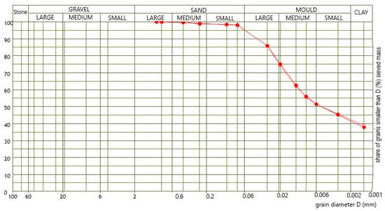 Distribution of particles of the raw materials was determined according to the ASTM D 422–63 standard [31], and the results of the testing are shown in Figure 2 and Table 4. The dispersion of the sample for the hydrometer method was done in an electric mixer; the duration of mixing was 1 min.